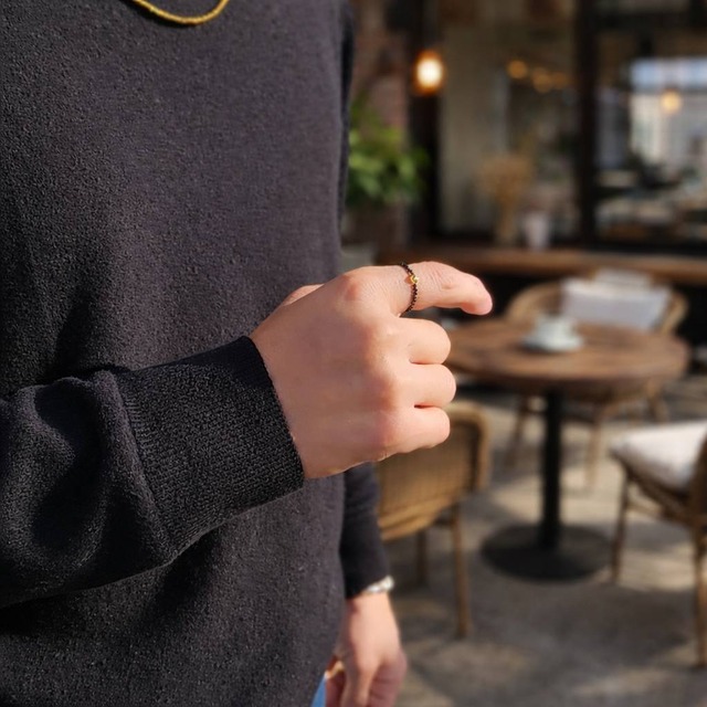 ★ブラックスピネルの小粒ラウンドカットビーズでリングを作りました。 漆黒に光り輝く様は、高級感を漂わせます♪ スペーサーの素材は、コッパー(銅)になりますが、見た目はゴールドカラーなので、より高見えするでしょう^^ ◆スピネルとは・・・。 スピネルは化学組織の異なる21種の鉱物群からなるグループ名であり、宝石として知られるもののほとんどがマグネシアスピネルに分類されます。多彩な色を持ち、良質のルビーやサファイヤに酷似するレッドやブルーの美しいもの、ピンク、パープルなどのカラーバリエーションが見られます。 スピネルという名前は「端」のあるという意味の<Spina>に由来します。 スピネルの持つ活性の力は生命エネルギーを高め、日々の生活を張りのあるものにしてくれます。 目標達成については経営、事業等と言うよりは、個人的なレベルのもので、仕事、試験から恋愛に至るまで、思いを強化し、現実化する為の強いサポートとなります。また、改善が難しい悪習間を絶ち、自己改善を行うにもスピネルは良い助けとなってくれる石です。 【詳細】 〇天然石 ・ブラックスピネル:約2mm ・号数・・・15~16号 ・穴サイズ・・・約0.5mm ・色合い・・・ブラック ・スペーサー素材・・・コッパー(銅) 【号数】 〇写真の号数:15~16号 15~16号までは、販売価格で購入できます。15号以下の調整は無料です。 ●17号以上は、下記金額にて追加製作可能です。 17号:100円、18号:200円、19号:300円、20号:400円、21号:500円、22号:600円、23号:700円、24号:800円、25号:900円、26号:1000円、27号:1100円、28号:1200円、29号:1300円、30号:1400円 ※号数は、作品ページのプルダウンよりお選びください。 その他、気になる点がございましたら、ご質問よりお待ちしております♪