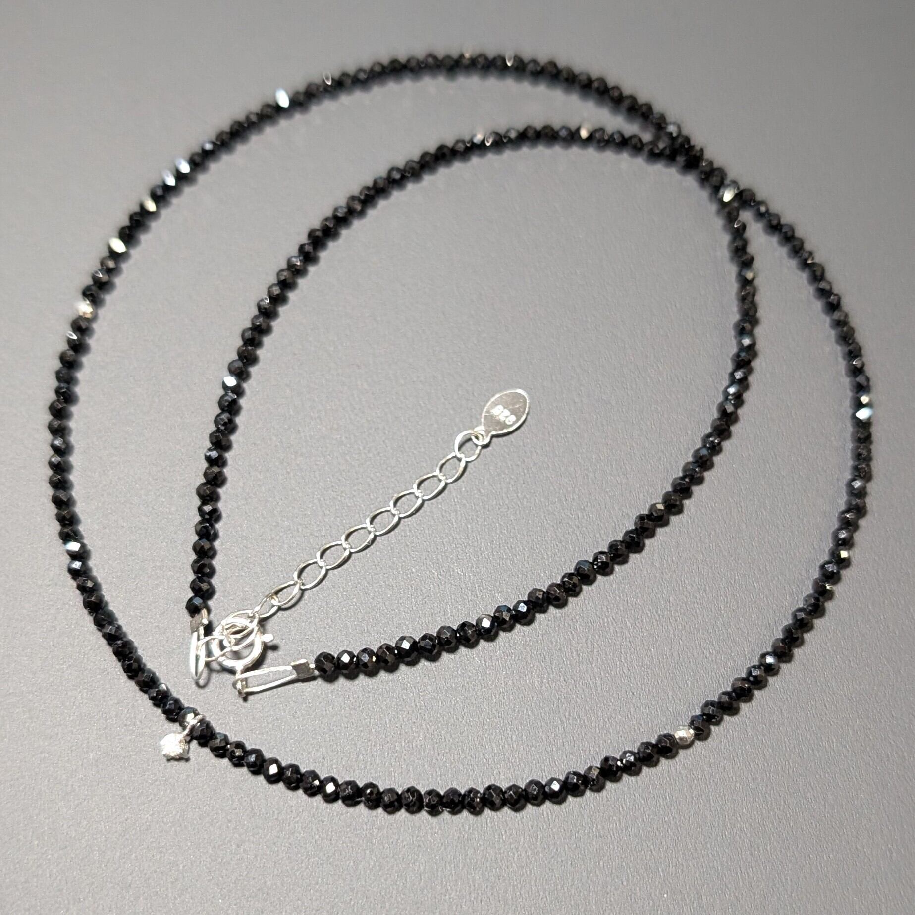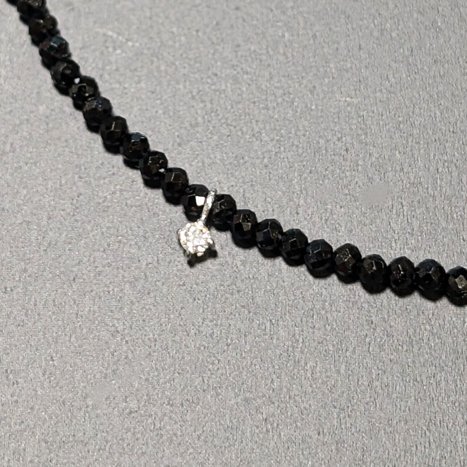 ☆0.03ctのダイヤが入った、K18WG/ホワイトゴールドペンダント、トライアングルカットビーズとブラックスピネルを組み合わせて製作した、高級パワーストーンネックレス!!