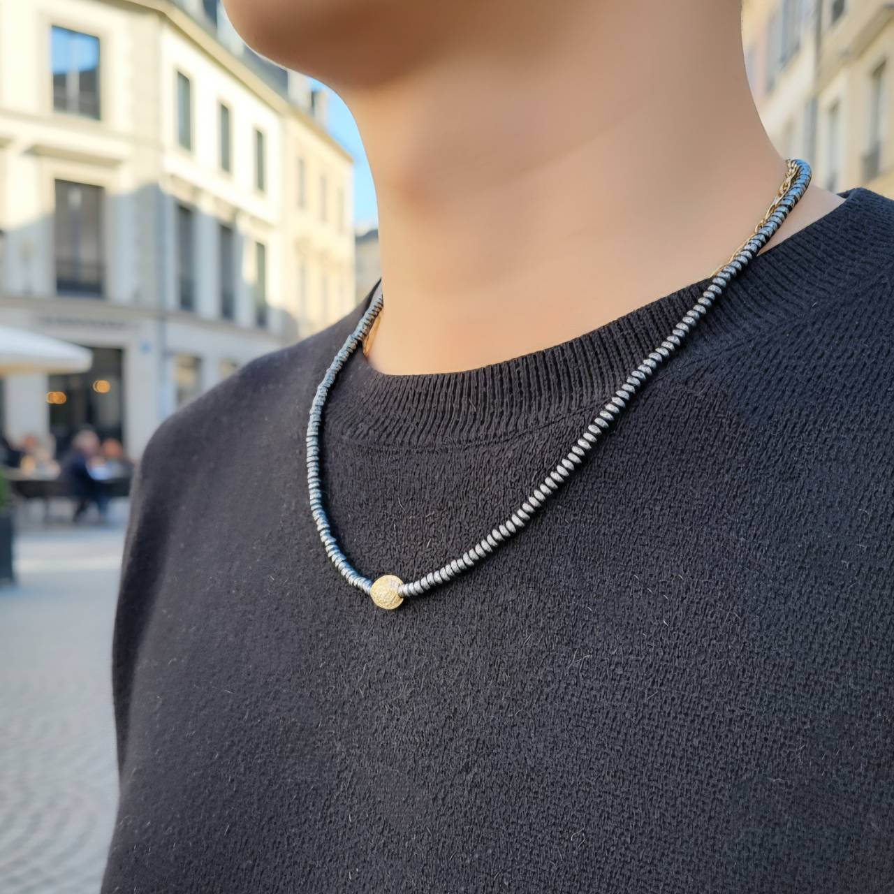 超強力マグネットクラスプを留め具に配置して、金属光沢のある黒銀色が特徴のヘマタイトを組み合わせた磁気ネックレスです。